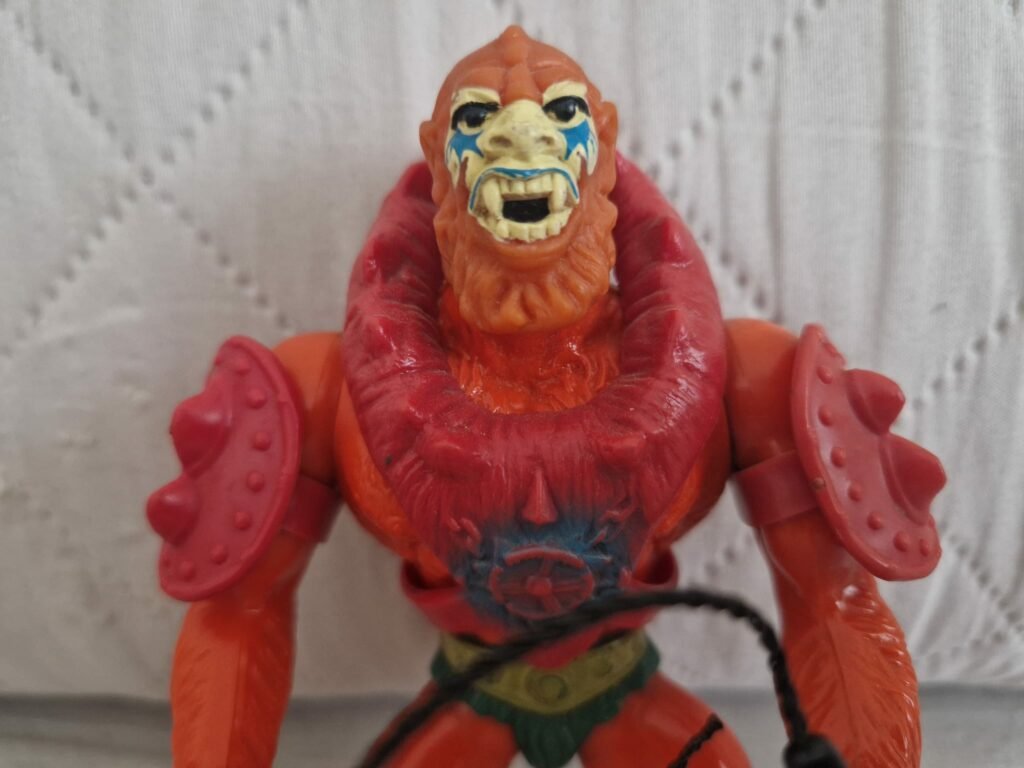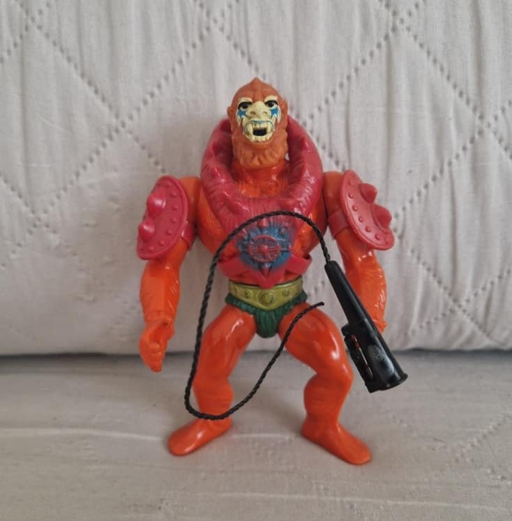 caratterizzato da un colore arancio scuro, testa morbida e semitrasparente e dell’armatura dipinta con l’azzurro attorno all’emblema. Frusta più corta e non marcata. Personaggio marcato Mattel inc 1981 Mexico. Vi piace?![]()