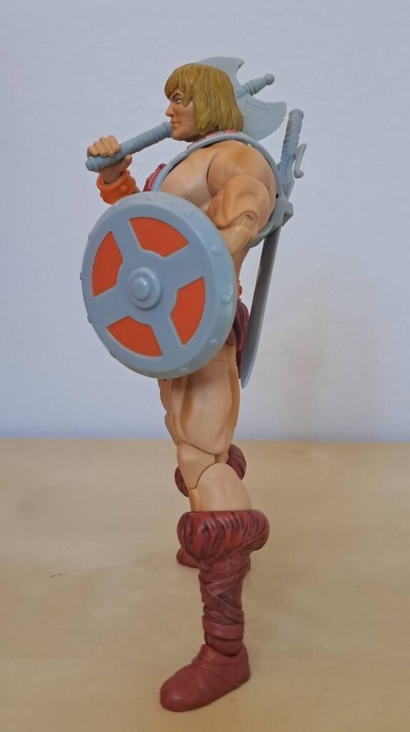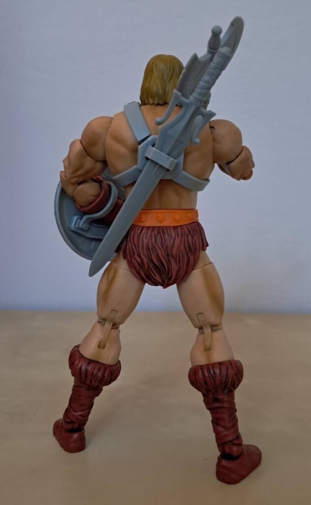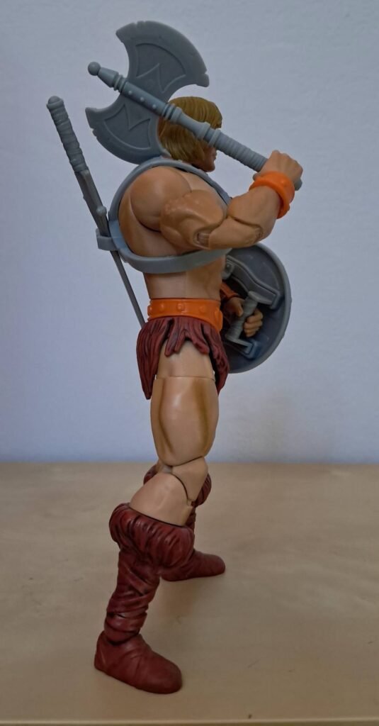 A livello di articolazioni, tutto in regola. Anzi faccio notare che questo è il primo pupazzo tra i Masterverse ad avere lo snodo trasversale nella mano destra, che gli permette di tenere la spada sollevata verso l’alto. Caratteristica che verrà ripresa per il Principe Adam e forse anche qualcun altro, ora non ricordo.