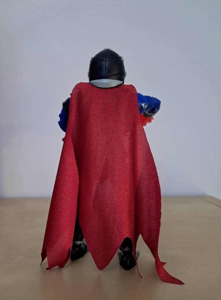 Passando alla testa, notiamo come questa riprenda alla perfezione quella del cartone, purtroppo appare anche “sporca” (non so se volutamente) e con qualche difetto di produzione un po’ troppo in vista. Il cappuccio/collare è rimovibile e serve a fissare il mantello (elemento che nel cartone non ha), tuttavia il sistema è un po’ troppo moscio e ballerino, senza un vero meccanismo di aggancio che lo tenga piú fisso.