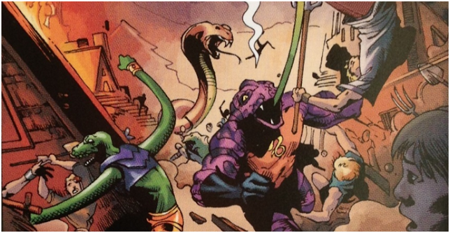 Nella Dimensione Senzanome, Serpentia spinge l’Innominato a creare gli Uomini Serpente, combinando il DNA del trollano con quello di altre tre razze aliene a sangue freddo: tre supremi guerrieri serpenti servono il mago.