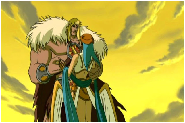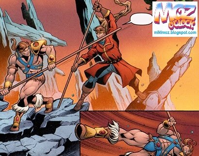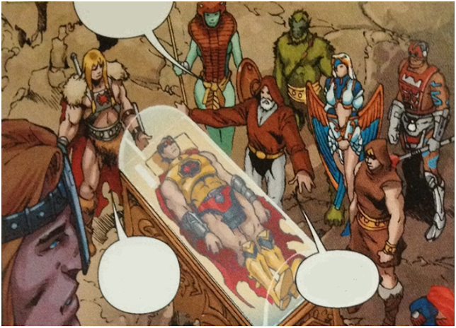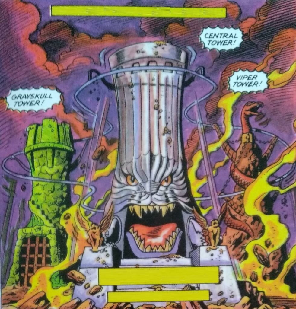 | LA MORTE DI HE-RO He-Ro viene colpito fatalmente da Hordak, e prima di morire dona la Spada del Potere al suo amico D’Vann. Gli Uomini Serpente vengono messi in fuga, spaventati dalla minaccia di Hordak di praticare su di loro l’Incantesimo della Separazione. Eldor fa sprofondare le Tre Torri a Subeternia, nelle viscere del pianeta, per evitare che altro sangue venga sparso a causa del loro potere: il gigante Megator resta ucciso, intrappolato nelle fauci della Torre Centrale. Hordak si ritira momentaneamente, ferito da Grayskull. |