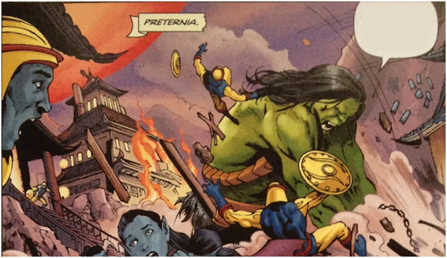 | HE-MAN E SKELETOR NEL PASSATO Nel futuro, Skeletor recupera la Ruota dell’Infinito e grazie ad essa arriva su Preternia col suo fidato Fang Man: il suo scopo è impedisce che venga eretto il Castello di Grayskull, così spinge il Clan delle Scimmie a occupare con una fortezza il luogo dove sorgerà Grayskull. Anche He-Man giunge nel passato con alcuni Dominatori, e alleatosi a Zilora, sventa i piani di Skeletor che torna nel suo tempo abbandonando a Preternia sia Fang Man sia la Ruota dell’Infinito. Fang Man si ritiene così su un’isola, seppellendo lì l’arte magicofatto: senza saperlo, “crea” un luogo dove il tempo non passa, che viene chiamato l’Isola delle Lacrime. |