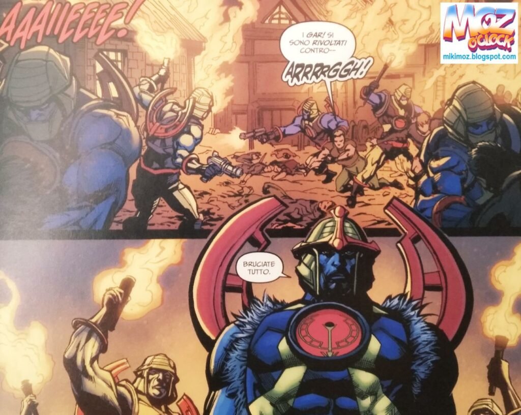 | L’INTRIGO DI HISSS Re Hisss, approfittando della debolezza di D’Vann, divora il suo consigliere Adi, rappresentante dei Gar, e ne assume l’aspetto. Riesce così a ingannare tutto il popolo dei Gar, spingendoli a tradire Re Grayskull: costoro si rivoltano, mettendo a ferro e fuoco il regno. |