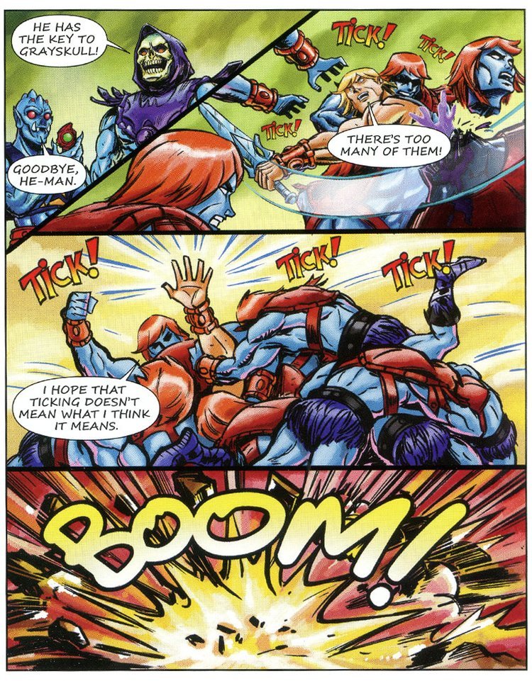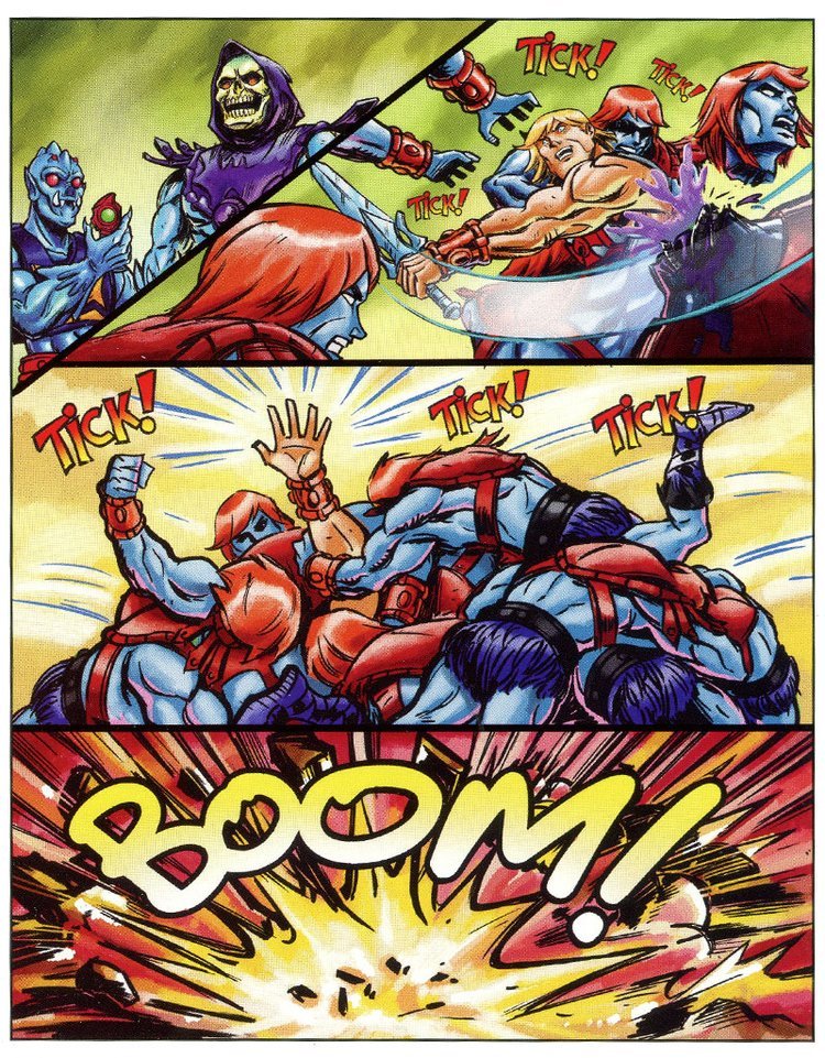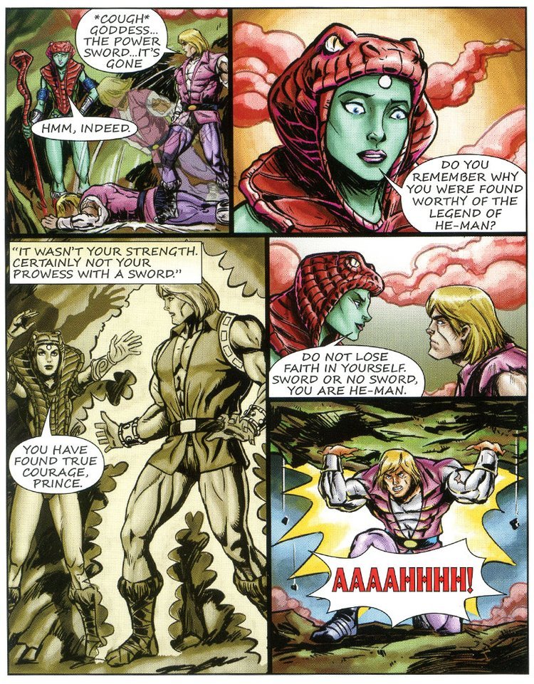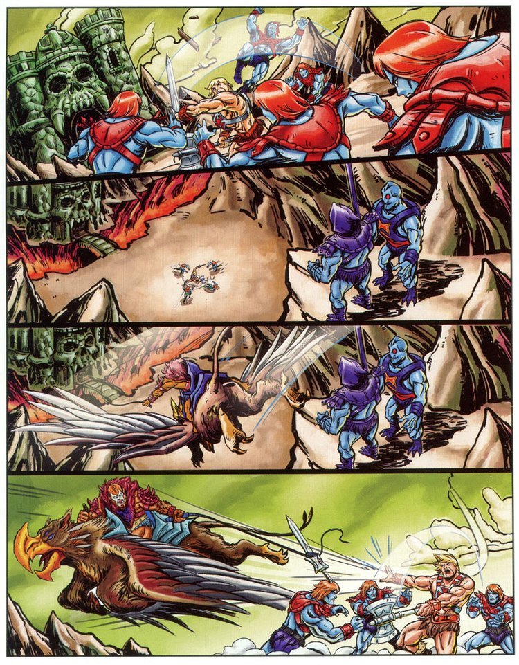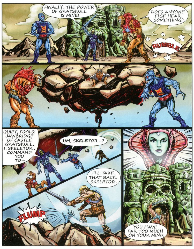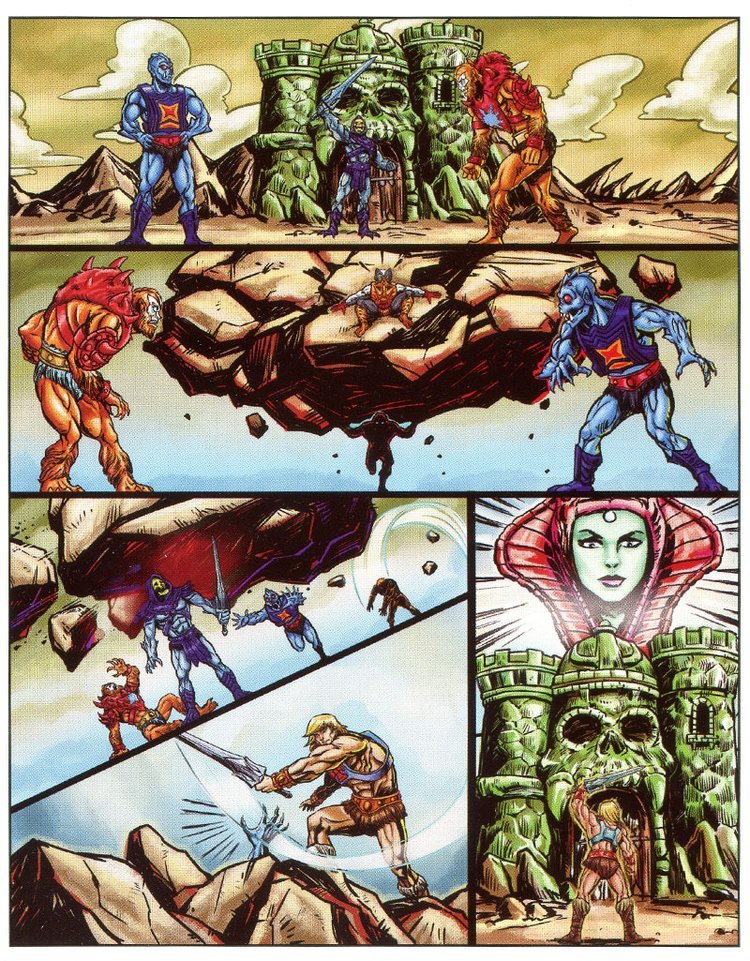 Prima che Skeletor possa accedere al Castello di Greyskull si diffonde un forte tremore e la montagna si solleva, da sotto si intravede He-Man (trasformato senza spada?!) che con un lancio poderoso abbatte i nemici riprendendosi la Spada.