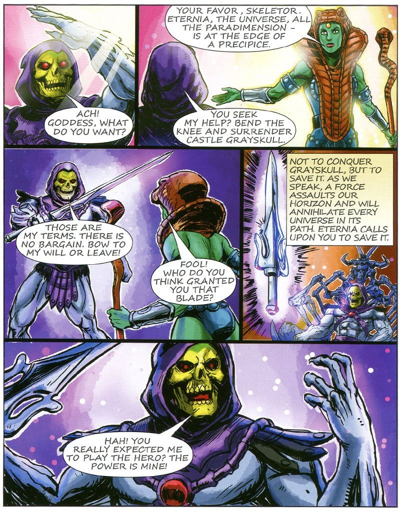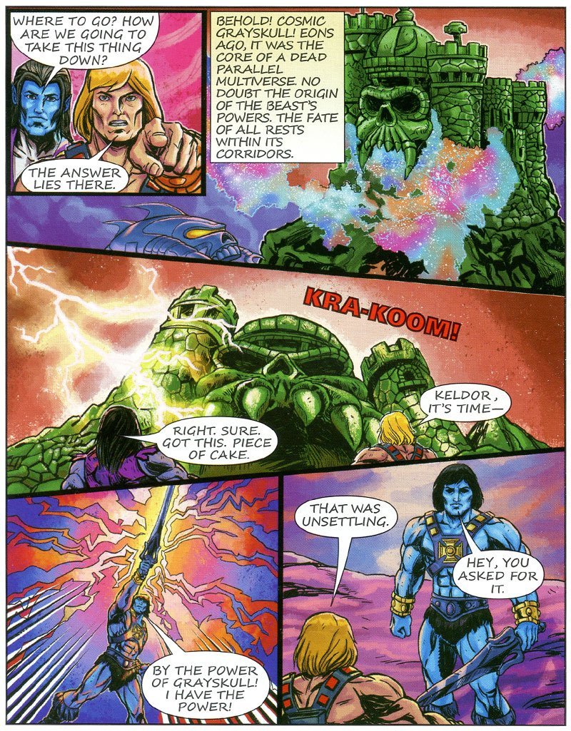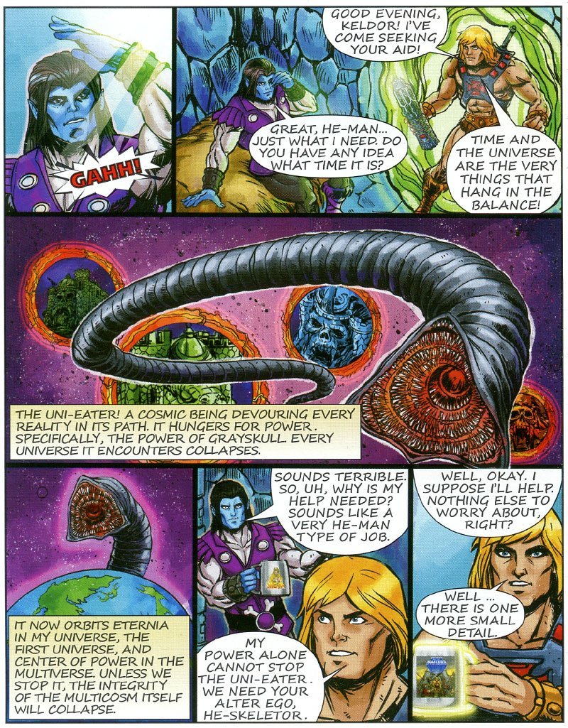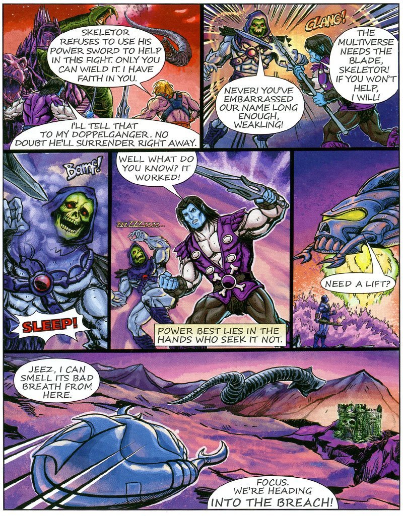 Terza pagina: He-man , utilizzando la Chiave Cosmica, va’ a cercare Keldor per chiedere aiuto; comincia lo spiegone di come un Mega Verme Interdimensionale si diverta a divorare le realta’ e sopratutto i Mondi dove c’e’ il Castello di Grayskull e il suo potere! Naturalmente ora e’ il Castello di Eternia Originale (Eternia Prime?) ad essere minacciato e dato che si trova al centro del Multiverso e’ un pericolo estremo. Keldor e’ scettico ma He-Man vuole l’aiuto del suo alter ego: He-Skeletor! (alcune easter egg: vengono mostrate 2 tazze con i loghi della serie animata di She-ra e di He-Man 200X)
