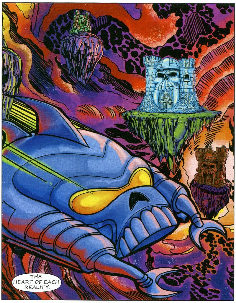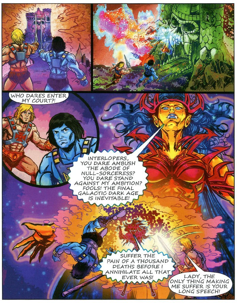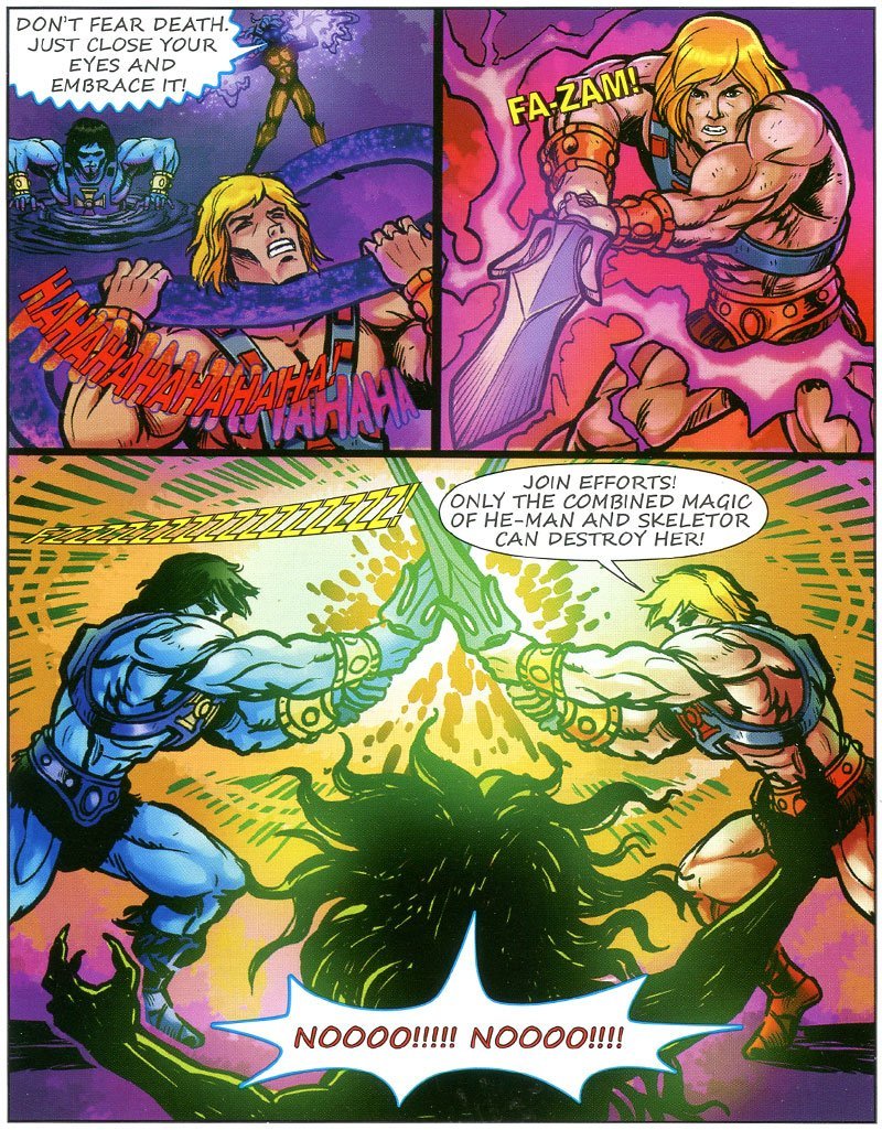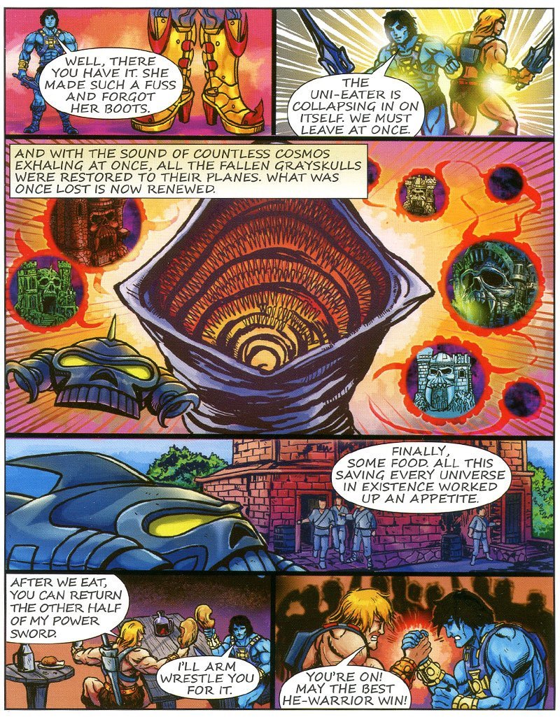 Terza pagina: He-man , utilizzando la Chiave Cosmica, va’ a cercare Keldor per chiedere aiuto; comincia lo spiegone di come un Mega Verme Interdimensionale si diverta a divorare le realta’ e sopratutto i Mondi dove c’e’ il Castello di Grayskull e il suo potere! Naturalmente ora e’ il Castello di Eternia Originale (Eternia Prime?) ad essere minacciato e dato che si trova al centro del Multiverso e’ un pericolo estremo. Keldor e’ scettico ma He-Man vuole l’aiuto del suo alter ego: He-Skeletor! (alcune easter egg: vengono mostrate 2 tazze con i loghi della serie animata di She-ra e di He-Man 200X)