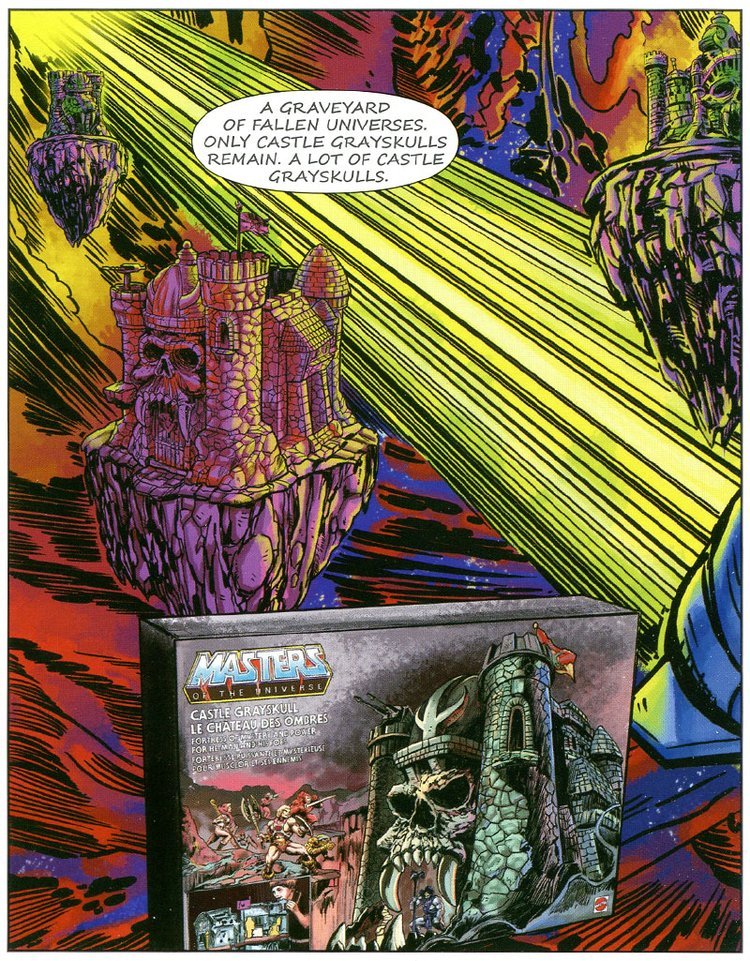 La Quinta e Sesta pagina sono una Splash-page dove troviamo l’Astronave attraversare uno squarcio nelle dimensioni e fluttuare in mezzo a tante copie del Castello di Grayskull ma differenti per diversi dettagli (appare anche una scatola del modellino giocattolo del Castello).