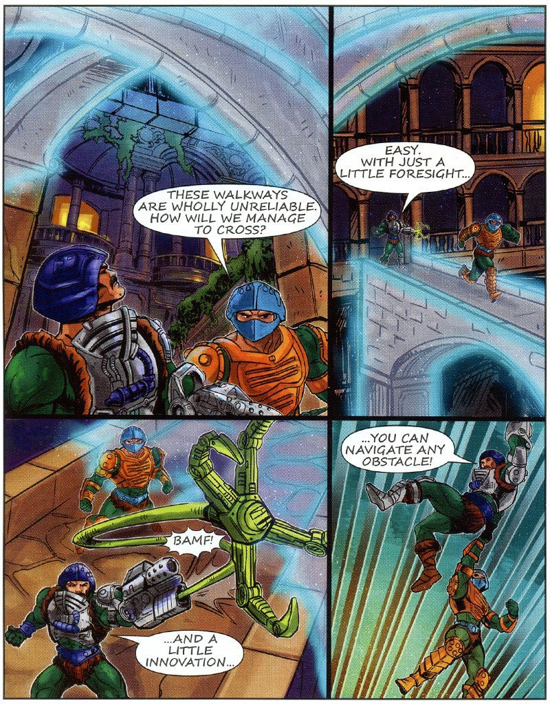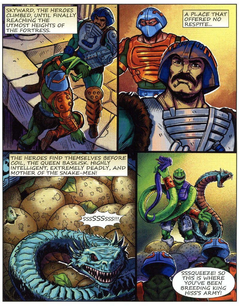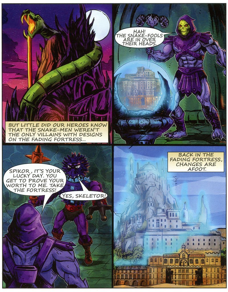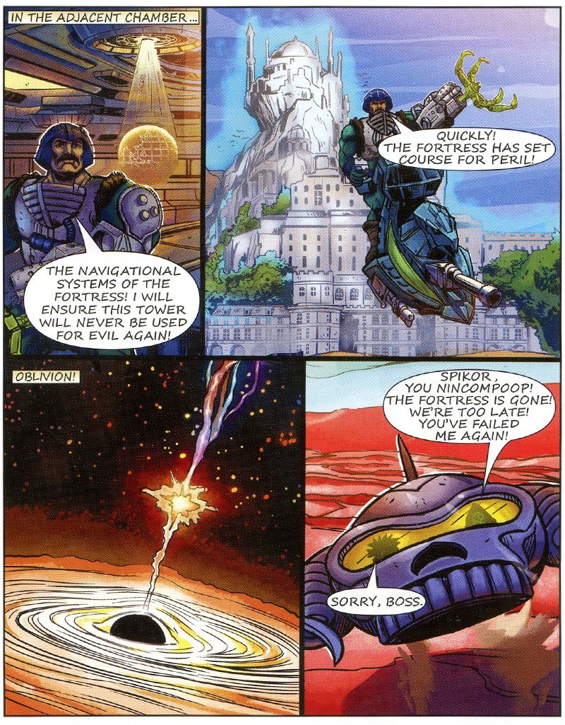 Presumiamo che Duncan abbia vinto poiche’ lo troviamo nella pagina seguente in sella di uno Skysled fare ritorno alla base; Ma Skeletor? beh aveva inviato Spikor con l’astronave Collector ma ha fatto evidentemente tardi…