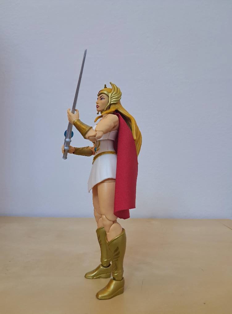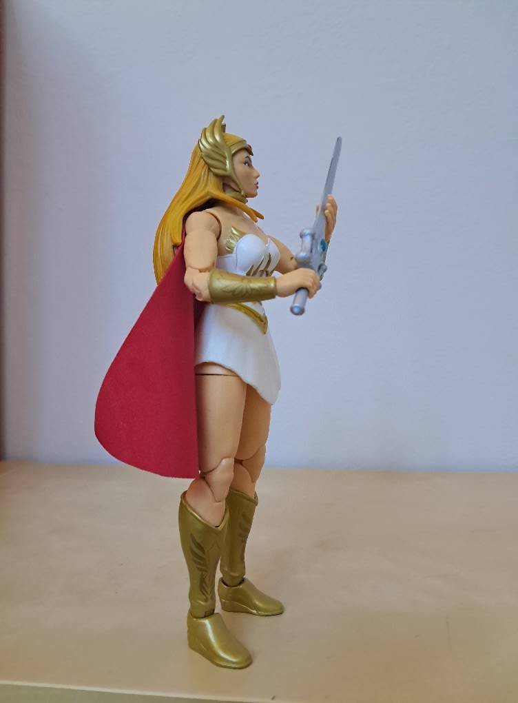 Un punto debole è rappresentato dal mantello, fissato mediante un antiestetico anello a girocollo, tipo collarino del gatto. Eppure non me ne posso lamentare dato che è proprio grazie a questo che ho potuto sostituirlo dopo averlo bruciato col ferro da stiro. Se fosse stato saldato al pupazzo in sé, come per altri personaggi, sarei rimasto bello e fregato e il mio disordine ossessivo-compulsivo non mi avrebbe dato pace finché non avessi ricomprato una nuova She-Ra completa solo per il mantello… Si vive davvero male ad essere dei pignoli in stile Furio, date retta…