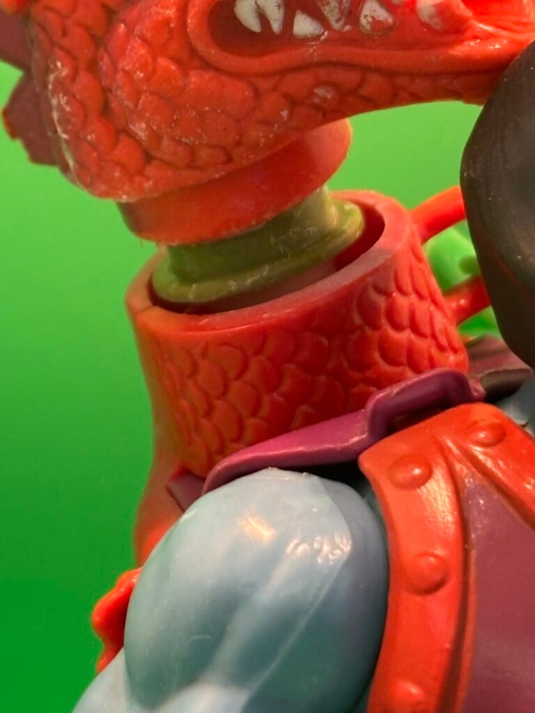 Questo Skeletor Dragon Blaster è caratterizzato dal collo del drago di colore verde e purtroppo, come molti collezionisti sanno, la vernice del viso spesso è molto brutta, anche se so che c’è qualche fortunato che l’ha trovato molto bello